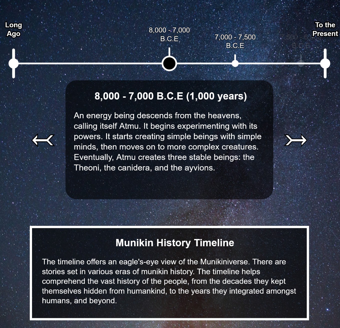 Megen is working on writing an entire universe. This timeline shows significant moments in munikin history.